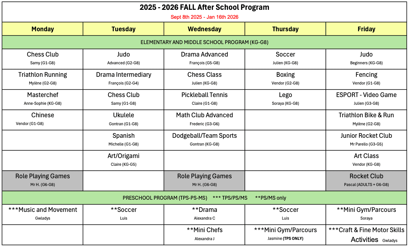 LFSD is proud to provide our community with a rich and diverse After school program. Find below our multiple offerings, from STEAM, Sports, Art, Singing, Cooking, Theater, Yoga, Dance and more …most importantly have fun with us!