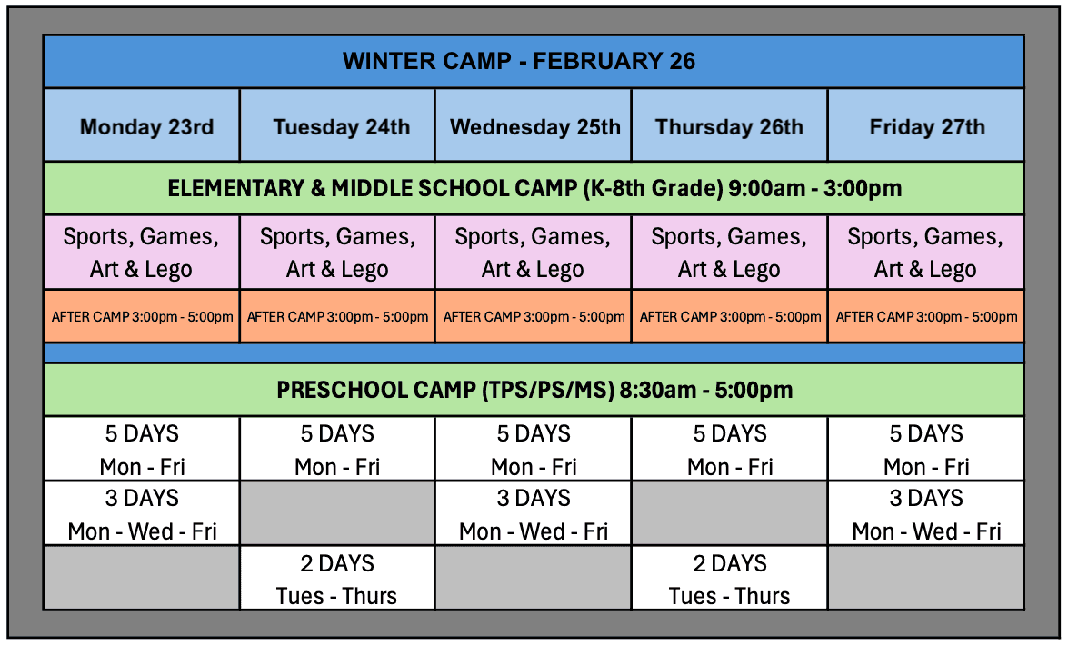 The elementary and middle school camp which is from 8:30 am to 3:00 pm, will offer different camp options that include Sports, Art, Games, and more… but most importantly it’s about having fun.